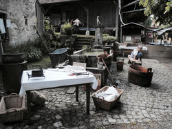 Am Brunnen vor dem Schloss war unser Waschplatz. Aus dem Waschhafen wurde die eingeweichte Wäsche gezogen. Danach kamen Seife, Bleuel und Waschbrett zum Einsatz. Schliesslich musste die Wäsche fachgerecht gespült und aufgehängt werden. Auch zeigten wir, wie mit Flach- und Kohlebügeleisen die Wäsche geglättet wurde.